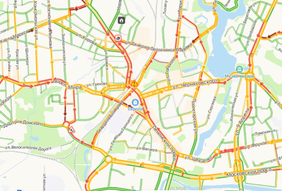 Согласно открытым данным, сложности с движением транспорта наблюдаются на основных магистральных улицах областного центра: проспекты Советский, Мира, Ленинский, улицы Черняховского, А. Невского, Горького.