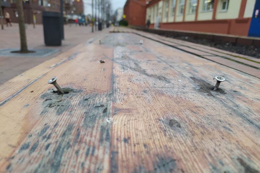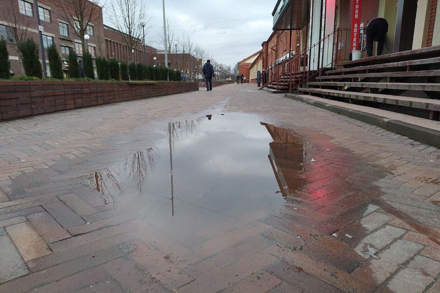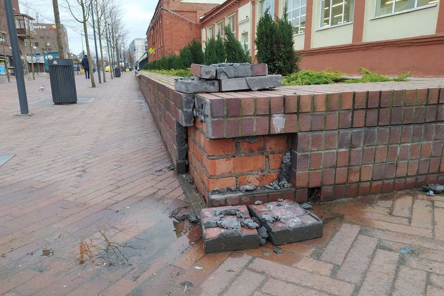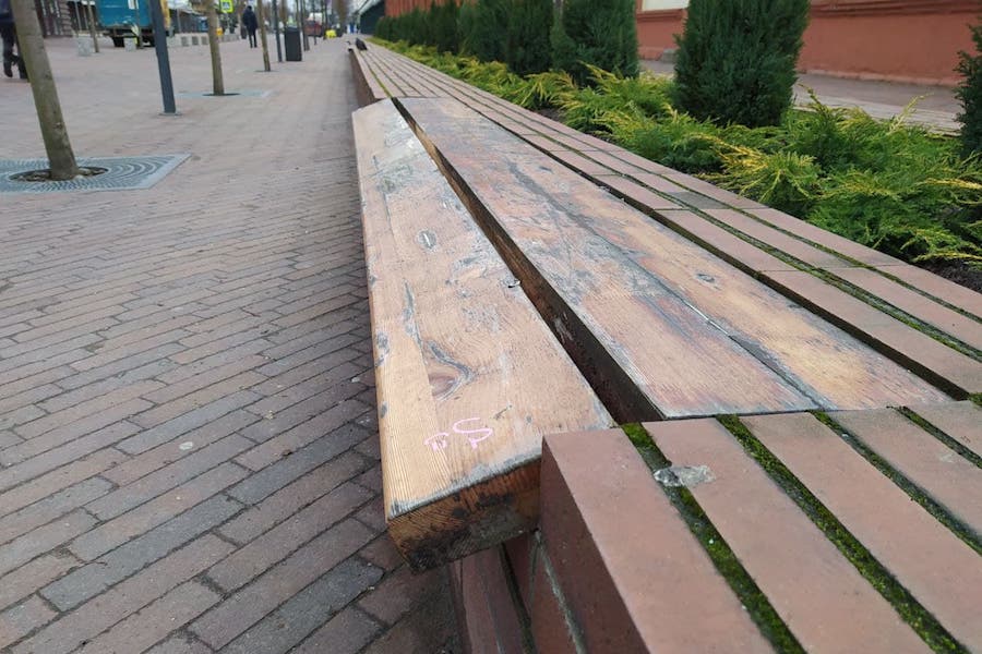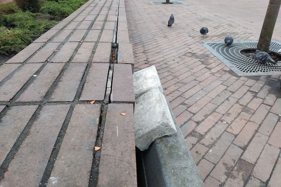 На пешеходной зоне на ул. Баранова местами отвалились облицовочные кирпичи на клумбах, вылезли болты, которые удерживают сиденья скамеек, «поползла» тротуарная плитка, передает корреспондент «Нового Калининграда».