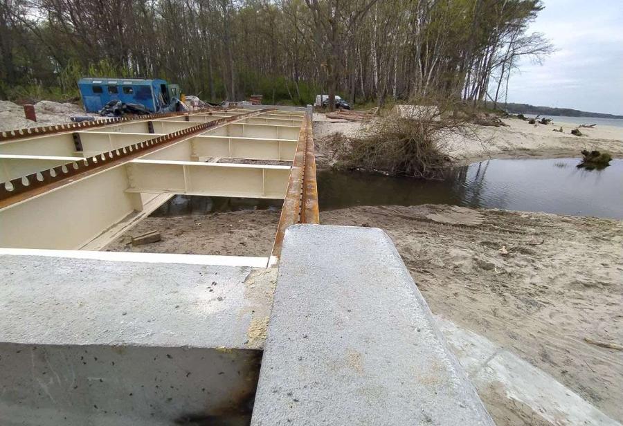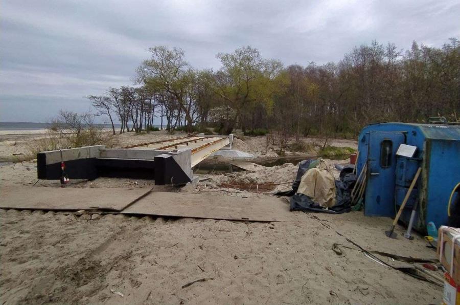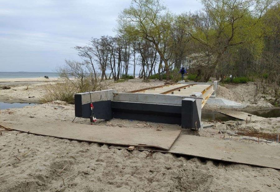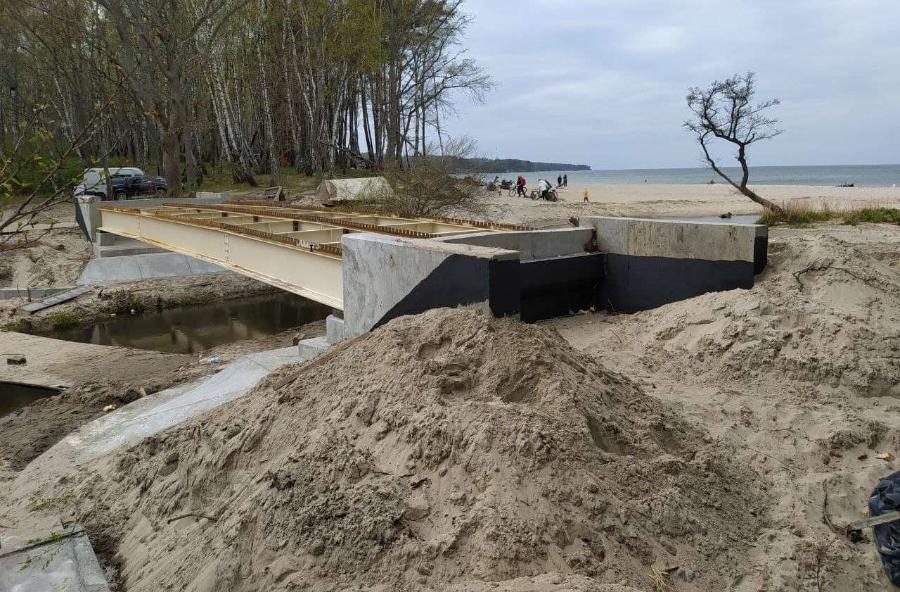 Железобетонный мост длиной около шести метров возводят возле моря за игорной зоной «Янтарная». C обеих сторон расположен лес, но строители заверяют, что вырубка деревьев не предусмотрена.