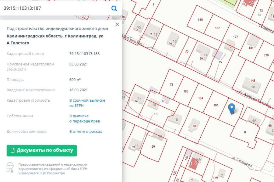 Участки с кадастровыми номерами 39:15:110313:185, 39:15:110313:183, 39:15:110313:184, 39:15:110313:186, 39:15:110313:187 расположены на ул. А. Толстого и предназначены для строительства индивидуальных жилых домов. Площадь каждого участка — 600 кв. метров.