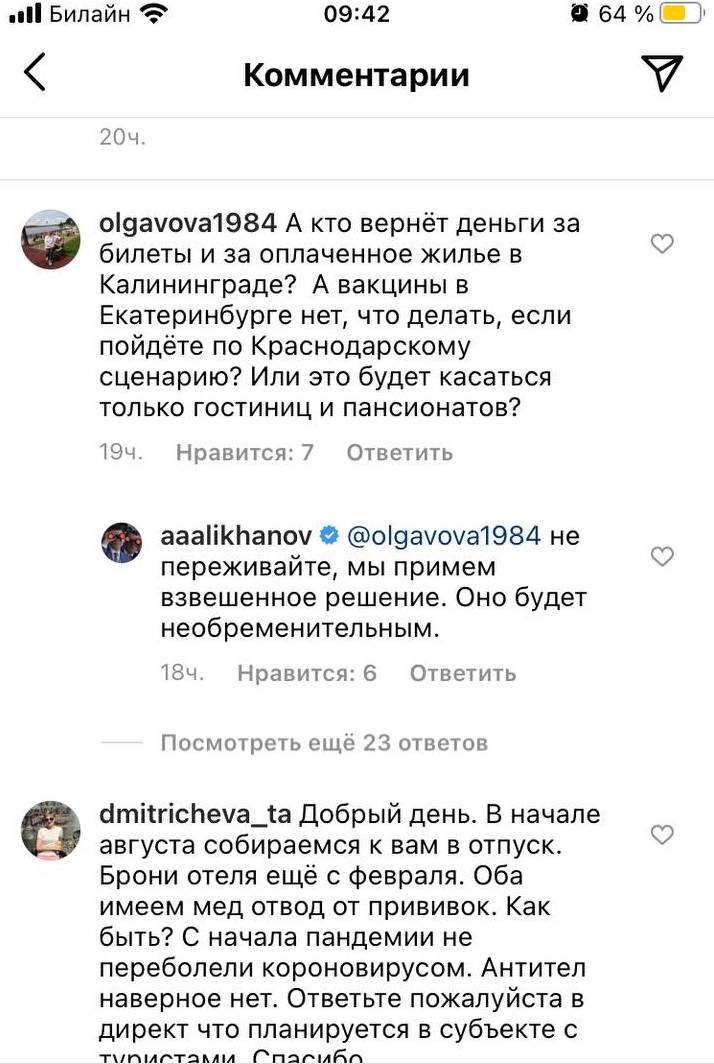 «Мы готовим правила для этой группы вместе с РПН. На неделе следующей объявим», — написал Алиханов в воскресенье. В другом своем комментарии он также отметил, что решение будет «взвешенным» и «необременительным» для тех, кто уже купил билеты и забронировал жилье для отдыха в Калининградской области.