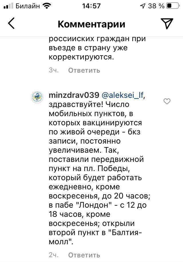 «Число мобильных пунктов, в которых вакцинируются по живой очереди, без записи, постоянно увеличиваем. Так, поставили передвижной пункт на пл. Победы [в Калининграде], который будет работать ежедневно, кроме воскресенья, до 20 часов. В пабе «Лондон» — с 12 до 18 часов, кроме воскресенья. Открыли второй пункт в «Балтия-молле», — отметили в минздраве.