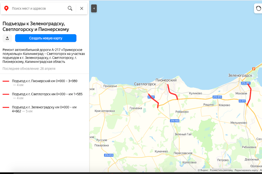 В рамках того же контракта ремонтируются подъезды к Зеленоградску и Светлогорску. Общая протяженность отремонтированных участков составит 12,070 км. Работы на подъезде к Зеленоградску сейчас завершаются.