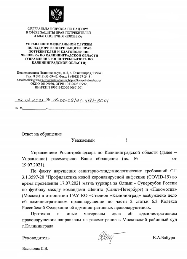 В отношении учреждения «Стадион „Калининград“» возбудили дело об административном правонарушении из-за матча за Суперкубок, который прошёл 17 июля. Об этом сообщается в ответе регионального управления Роспотребнадзора на обращение жителя областного центра.