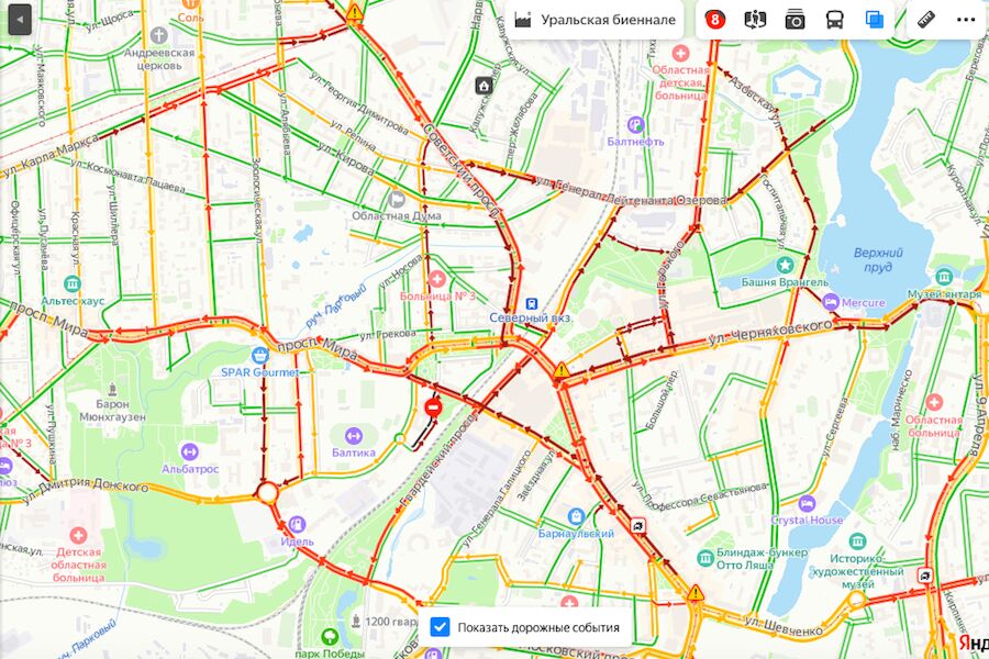 Вечером в среду, 13 октября, в Калининграде образовались 8-балльные пробки. Об этом свидетельствуют данные сервиса «Яндекс.Карты». Сложнее всего дорожная ситуация в центре города: на Советском и Ленинском проспектах, улицах Горького, Черняховского, стоят также Фрунзе, Карла Маркса, Гайдара-Островского, Правая Набережная, Краснокаменная, небольшой участок Невского и Большая Окружная, особенно в местах проведения дорожных работ.