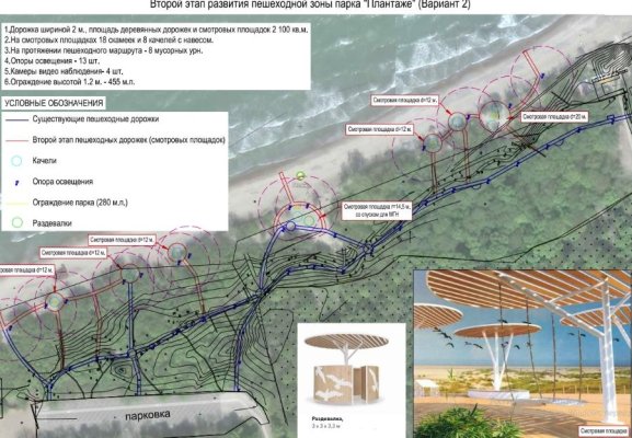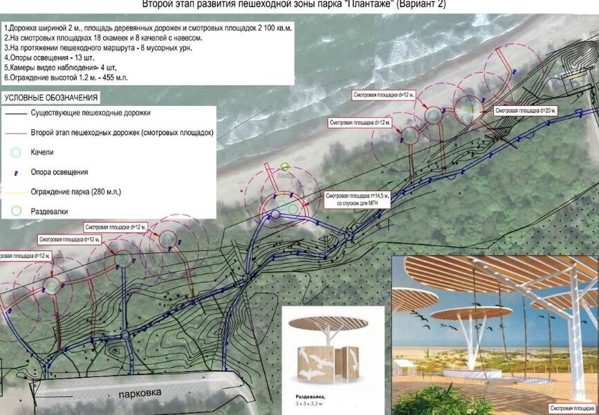 Согласно документации, в парке вдоль пляжа решили обустроить семь смотровых площадок со скамейками, качелями и раздевалками. Их должны соединить новыми пешеходными дорожками. Проект также предусматривает дополнительное освещение.