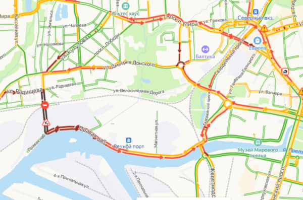 Согласно сервису «Яндекс. Карты», серьезные пробки наблюдаются на пр. Победы, ул. Радищева, ул. Вагоностроительной, ул. Правой Набережной, ул. Генерала Буткова, ул. Фельдмаршала Румянцева и ул. Дмитрия Донского.