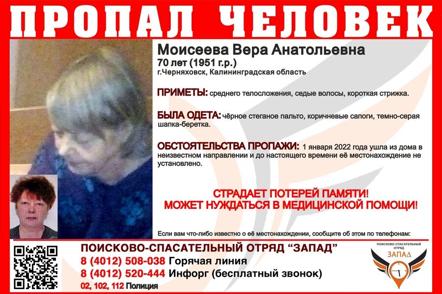 Если вам что-либо известно о местонахождении Веры Моисеевой, сообщите об этом по телефонам: 8 (4012) 508-038 — горячая линия ПСО «Запад», 8 (4012) 520-444 — инфорг ПСО «Запад», 02, 102, 112 — полиция.