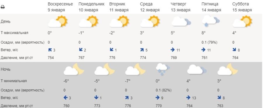 Калининградский ЦГМС пока публикует прогноз до четверга, 13 января. Согласно нему, дневная температура в течение четырех дней будет находиться на уровне −1°, ночная будет опускаться до −6°. Осадки не ожидаются.