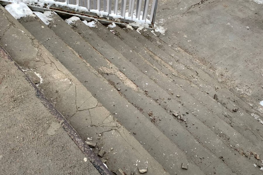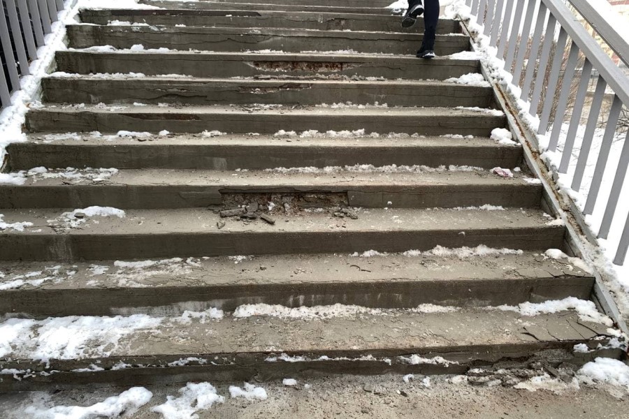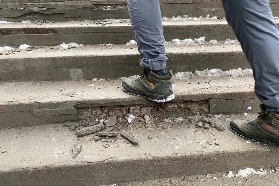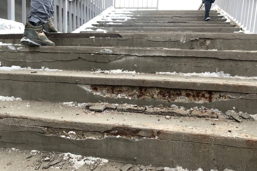 Последний снегопад показал хрупкость лестничного покрытия, которое местами отваливается кусками. Лестницы эстакадного моста в последний раз ремонтировались перед ЧМ-2018.