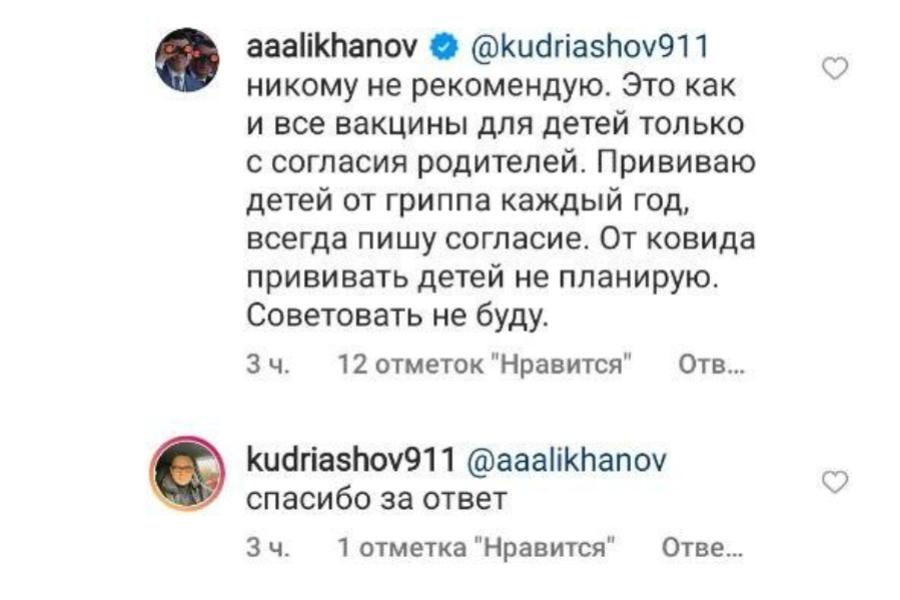 На это Алиханов ответил: «Никому не рекомендую. Это, как и все вакцины для детей, только с согласия родителей. Прививаю детей от гриппа каждый год, всегда пишу согласие. От ковида прививать детей не планирую. Советовать не буду».