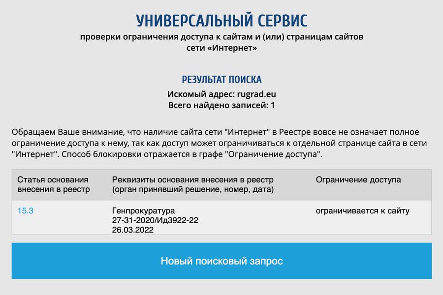 Роскомнадзор заблокировал калининградский информационный портал «Руград» по требованию Генпрокуратуры. Запись об этом содержится в реестре надзорного ведомства.