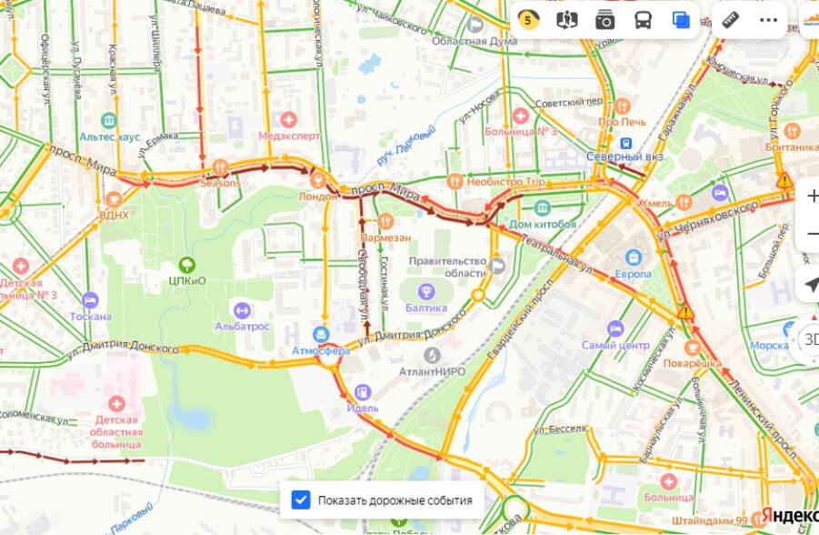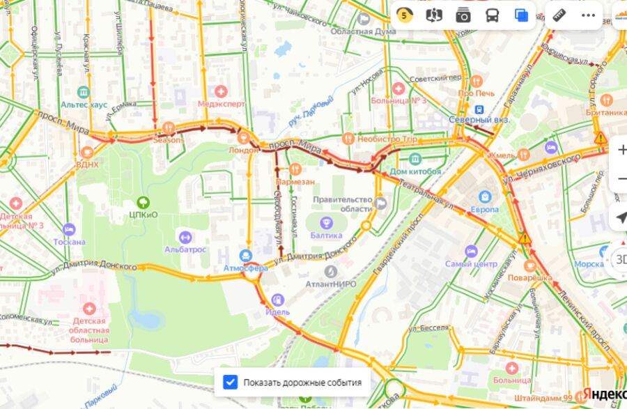 В Калининграде на проспекте Мира возникли сложности с транспортным движением после начала ремонта трамвайных путей у драматического театра. Об этом свидетельствуют сообщения автомобилистов и данные сервиса «Яндекс. Карты».