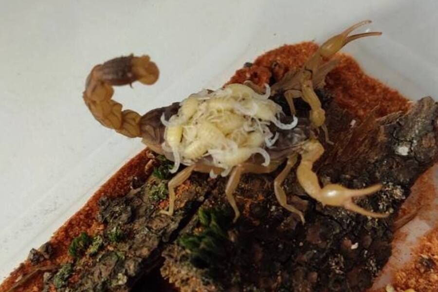 По словам Михаила, потомство у скорпионихи появилось два дня назад. Детеныши пока сидят на спине матери, и сосчитать их практически невозможно.