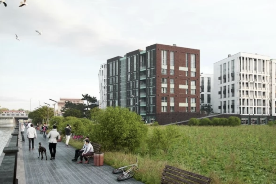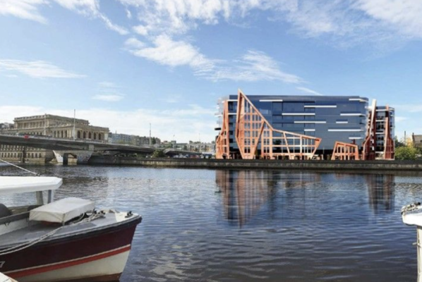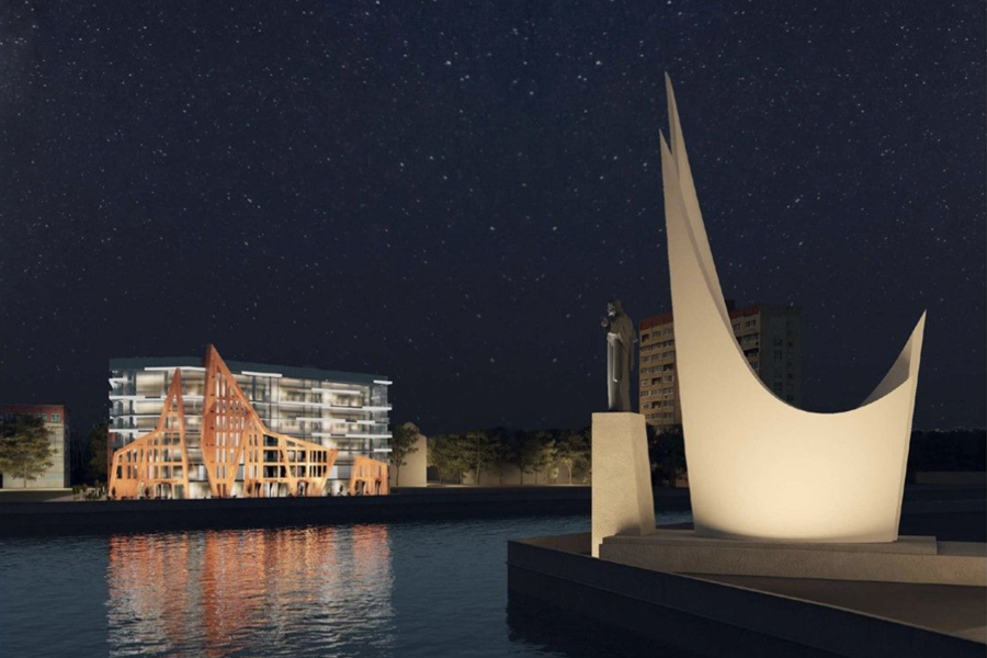 Проект, разработанный компанией «Селен» из Ижевска, предполагает панорамное остекление квартир, коммерческие пространства на первом этаже и подземную парковку. «Фасады жилого комплекса представляют собой стеклянный объём, заключённый в медную решётку. Решены в таких материалах, как медь — акцентный материал, стекло — основная масса фасада, и разные вкрапления в виде балконов и террас выделены белым цветом, — рассказала о проекте архитектор Елена Сенилова. — Основной фасадный приём — медная решётка — отчасти повторяет силуэты шпилей соборов и остроконечные крыши старой немецкой застройки, погружая в такую сказочную атмосферу, для туристов привлекательно. В то время как стеклянные объём растворяется в небе».