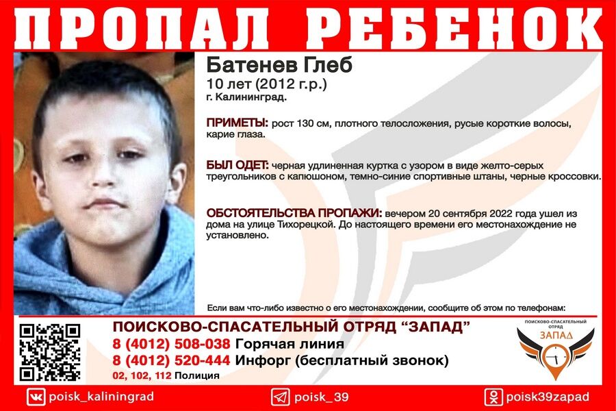 В Калининграде волонтеры и полиция разыскивают 10-летнего Глеба Батенева, который ушел из дома по ул. Тихорецкой вечером вторника, 20 сентября, и пропал. Об этом сообщает Поисково-спасательный отряд «Запад» в соцсетях.