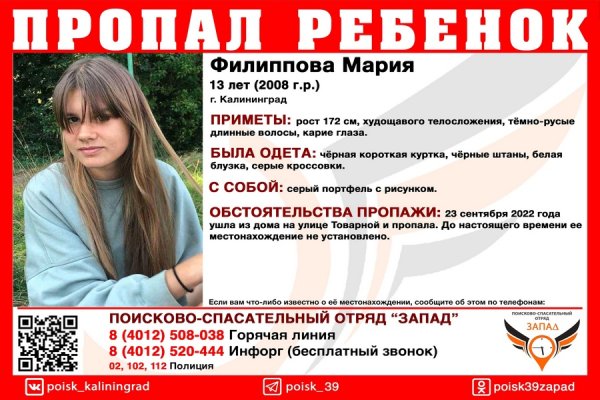 В Калининграде разыскивают 13-летнюю Марию Филиппову, пропавшую накануне. Об этом сообщает Поисково-спасательный отряд «Запад».
