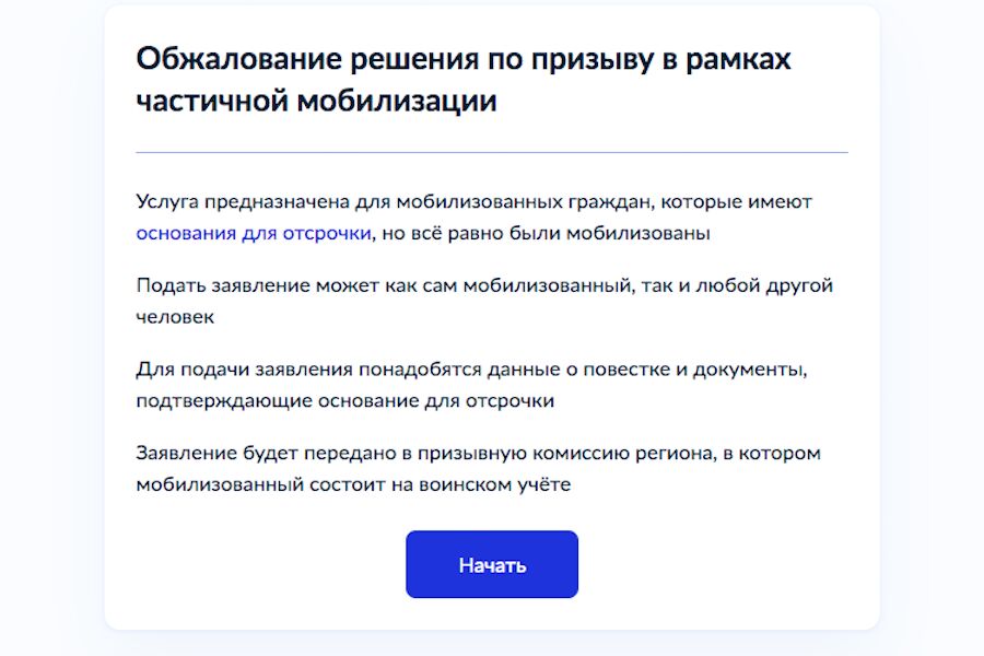 На портале Госуслуг появилась форма для обжалования решения о частичной мобилизации. Услуга предназначена для мобилизованных граждан, которые имеют основания для отсрочки, но всё равно были мобилизованы, говорится на сайте.