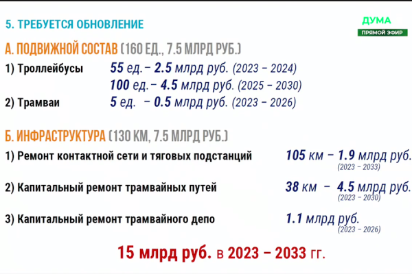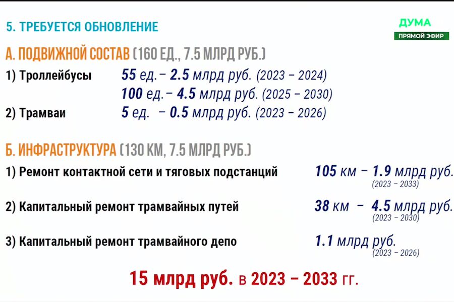 «Мы для себя просчитывали, прикидывали программу по переоснащению, реконструкции всего электрического транспорта. И для нас эта цифра примерно 15-18 млрд рублей за 10 лет мы для себя планируем. И если посмотреть на эти цифры, то где-то 60% всех затрат — это затраты на инфраструктуру: станции, трамвайные пути, линии, сети и все, что с этим связано», — сказал Рольбинов.