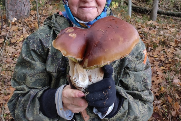 «Такого чуда никогда не видела! Стоял во всем великолепии, прикрывшись дубовыми листьями, на краю оврага рядом с елью. Мы уже собирались выходить на опушку, но я решила сделать ещё кружочек. Я очень хотела найти белый гриб, понимая, что лес уже готовится к зиме. Спасибо нашему замечательному и щедрому лесу».