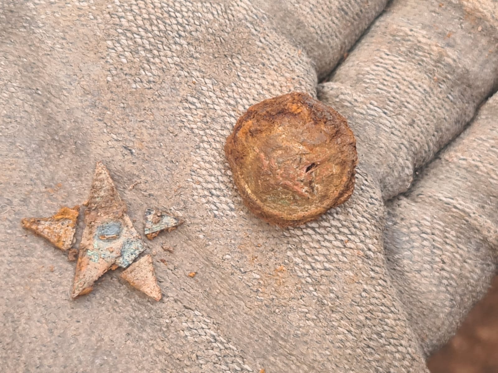 Найдены части военной амуниции, пуговицы, поясные ремни, ботинки, нагрудный знак «Отличный Артиллерист», орденская планка, монеты.