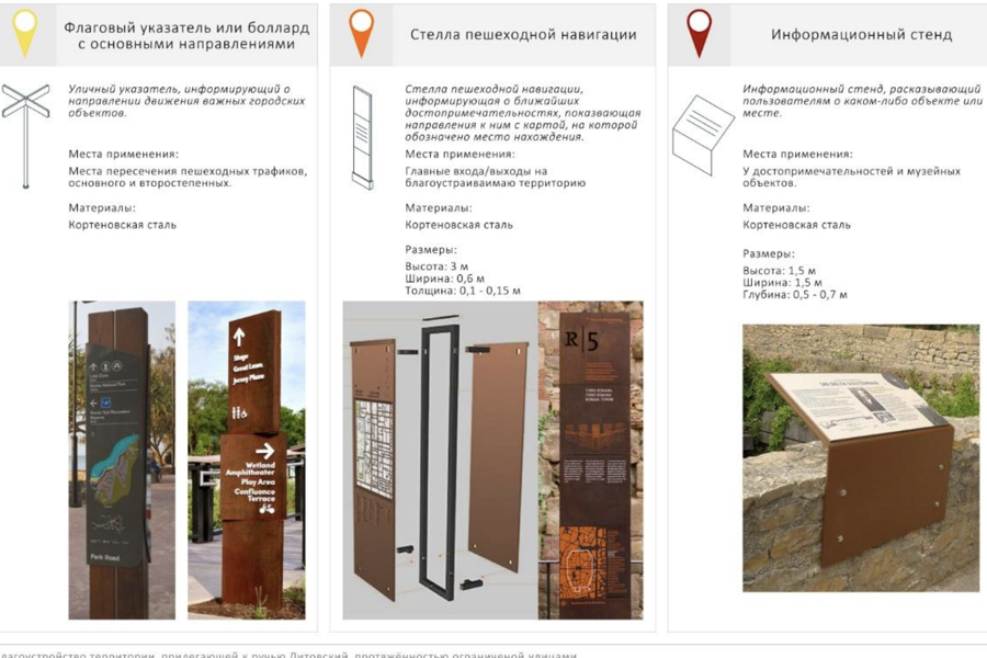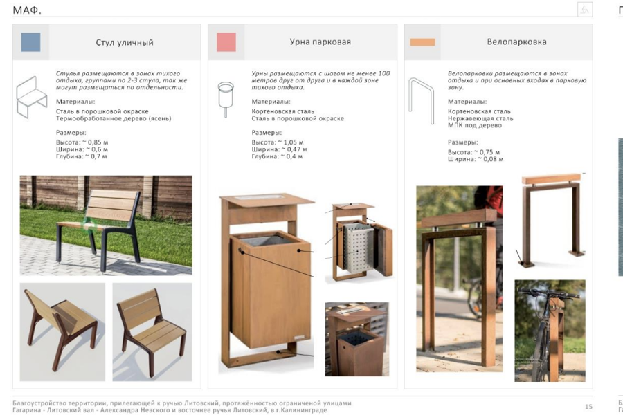 Для вальной стены предлагается сделать специальную декоративную подсветку, для функционального освещения — использовать фонари из кортеновской стали. «Мы заменили дизайн световых опор, сделав их более брутальными, более строгой формы. Мультипрожекторные светильники мы ставим в определенной ритмике, чтобы, с одной стороны, подчеркнуть геометрию бастиона и вальных укреплений, с другой стороны, выполнить всё в одном материале, не конфликтующем с брутальным, слегка обветшалым образом объекта. Все остальные малые архитектурные формы — велостоянки, урны, скамьи — мы пытались решить в едином контексте.», — отметил Виталий Русакович.