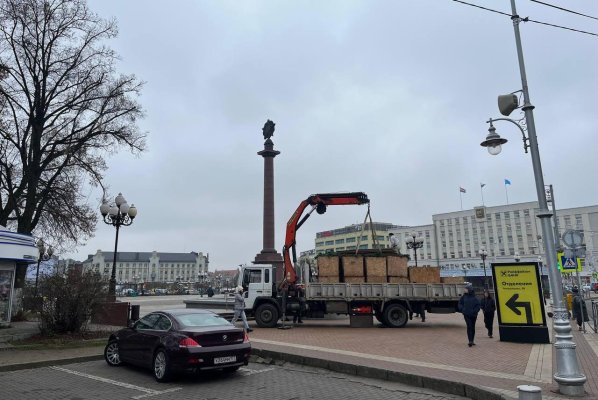 В Калининграде начинается монтаж праздничных украшений на площади Победы. На место уже привезли новогоднюю ель в разобранном виде.