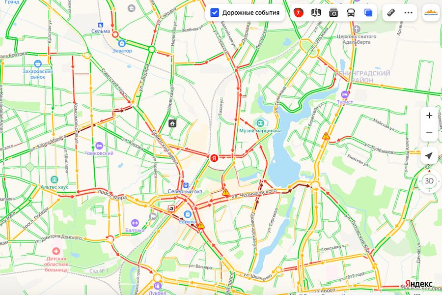 В Калининграде во вторник днем образовались серьезные пробки. Уже к трем часам сервис «Яндекса» оценил их в 7 баллов. Дорожную обстановку усугубляют аварии, одна из них случилась в центре, на пересечении Гвардейского проспекта и улицы Театральной. Отметим, что подобные заторы перед Новым годом для Калининграда — явление ежегодное.