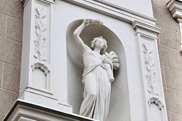 Оригинальная скульптура фасаде здания на ул. Спортивной, 4 сохранилась с довоенных времен.