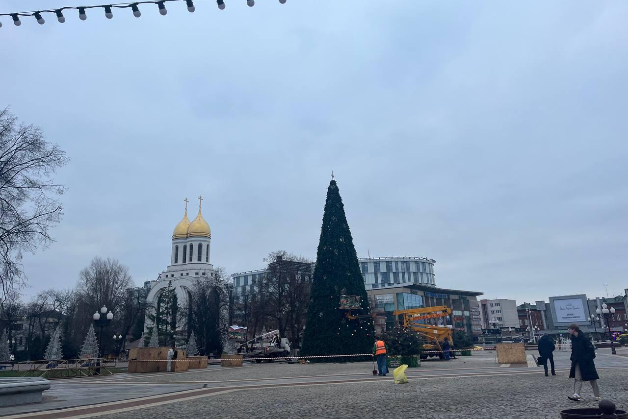 В Калининграде на площади Победы начали разбирать новогоднюю ель и демонтировать другие праздничные украшения.