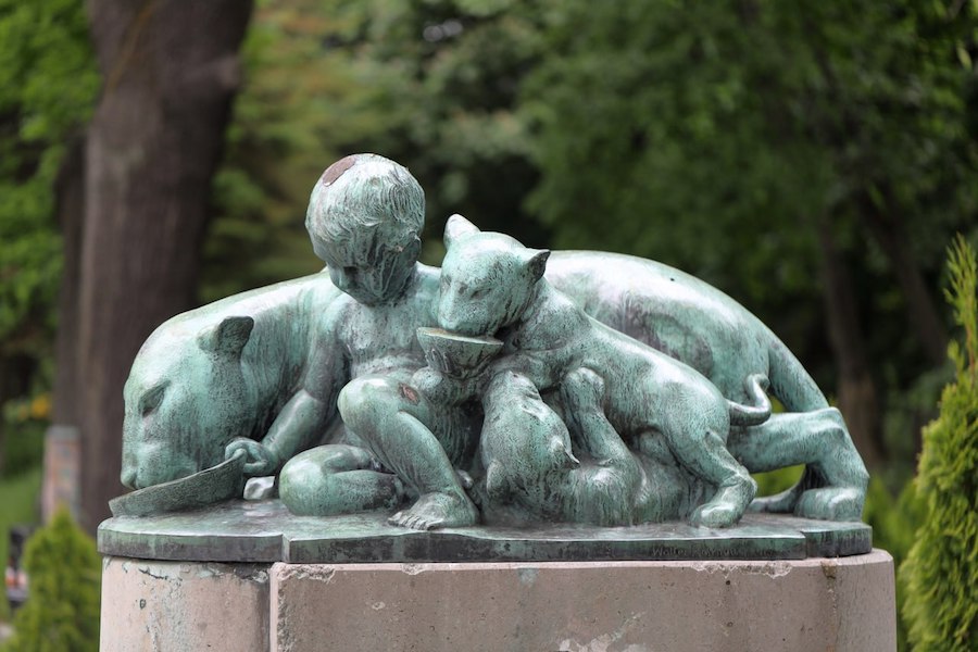 Бронзовый памятник на постаменте из искусственного камня работы скульптора Вальтера Розенберга был установлен в 1913 году на главной аллее Калининградского зоопарка. По данным сайта «Пруссия.39», в послевоенные годы памятник считался утраченным. В середине 80-х была найдена бронзовая верхушка памятника, изображающая ребенка, кормящего львицу со львенком.