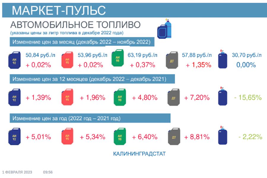 В Калининградской области в декабре прошедшего года продолжился рост цен на бензин и дизтопливо. Годовой рост еще существеннее месячного. Подешевел в регионе только один вид топлива — газомоторное. Об этом свидетельствуют свежие данные Калининградстата.
