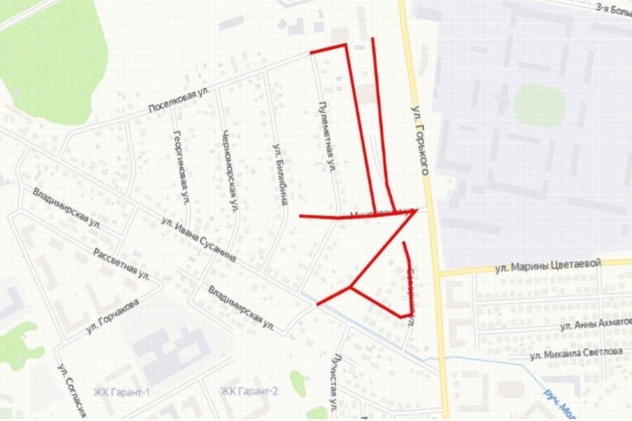 Речь о 6-ти небольших существующих или проектируемых улицах между ул. Горького, Сусанина, Пулеметной (ориентир — детский комплекс «Кидсберг»). Работы нужно выполнить в течение 7 месяцев, стоимость контракта (начальная или максимальная) — 58,6 млн рублей.