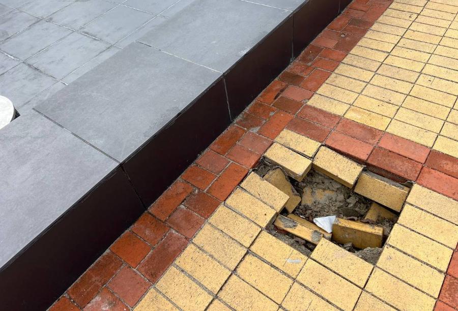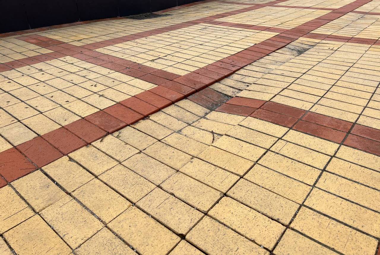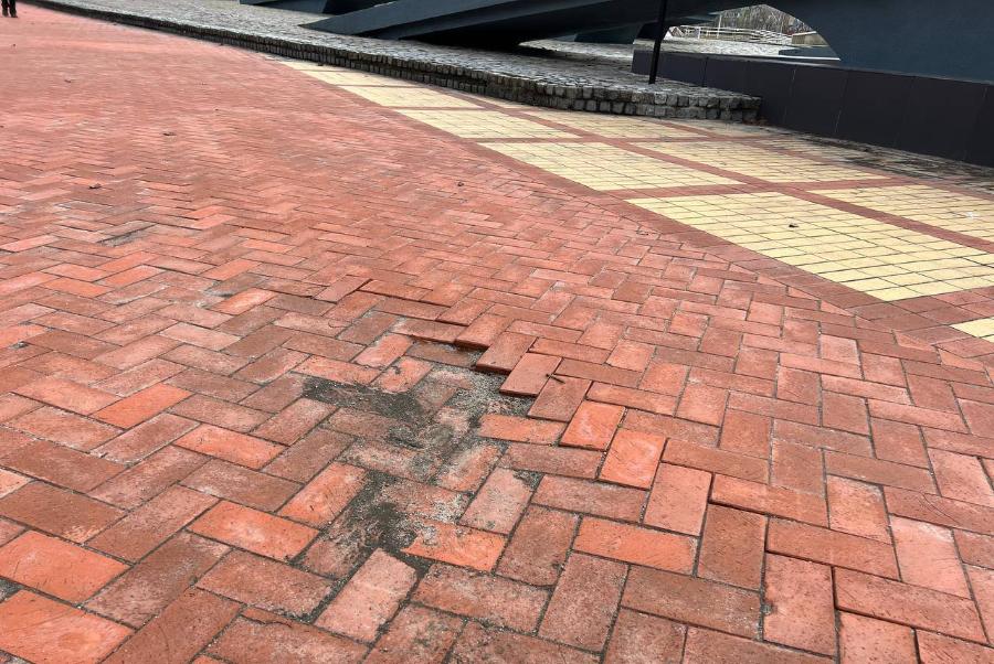 Дефекты стали появляться в течение зимы. Пешеходная зона «пошла волнами», у отремонтированной чаши фонтана образовался провал.