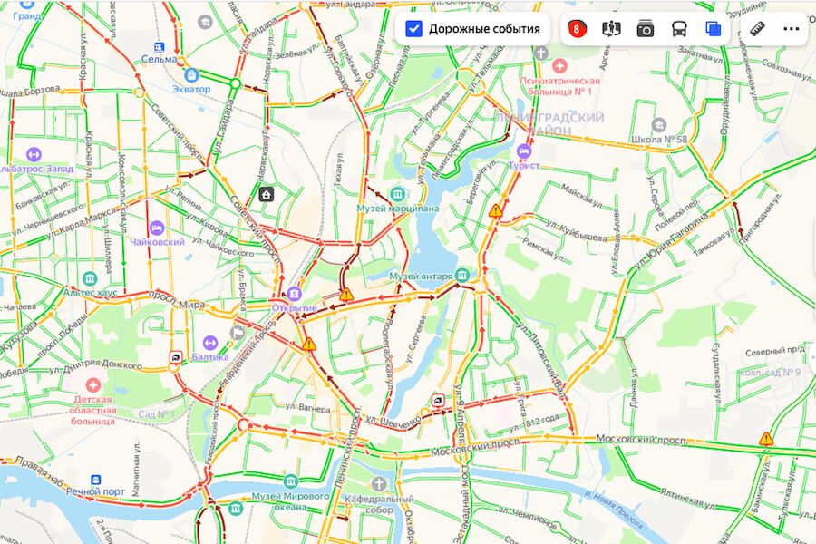 В Калининграде вечером во вторник, 7 марта, образовались 8-балльные пробки. Об этом свидетельствуют данные сервиса «Яндекс.Пробки». Хуже всего ситуация в самом центре города — на Горького, Черняховского, Гаражной, Ленинском проспекте.