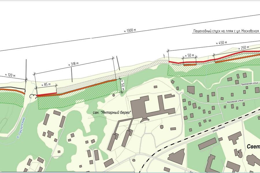 Проектировщикам нужно будет выполнить ряд изысканий: геологических, экологических, археологических и др. Спроектировать нужно будет 3 участка противооползневых сооружений общей длиной 880 метров; они появятся на отрезке почти в 1,5 км. Как отмечается в опубликованном акте обследования берега, он подвержен «абразионно-обвальным процессам, которые приводят в разрушению берегового откоса». Высота разрушений — 32-40 метров. Рядом, в пос. Отрядное, находится берегозащитная железобетонная опояска, состояние которой характеризуется как аварийное. «Имеющийся пляж недостаточной ширины и мощности и аварийная ж/б опояска не обеспечивают защиту берегового откоса от штормового волнения», — делается вывод в документе.