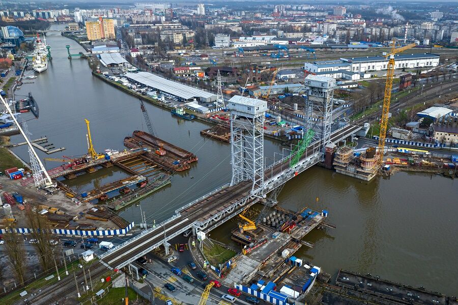 Железнодорожный мост через реку Преголю по своей конструкции является одним из немногих транспортных сооружений в России с вертикально-подъёмным центральным пролётом.