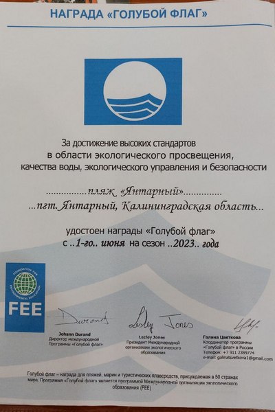 Янтарный вновь удостоен международной награды «Голубой флаг» за подготовку пляжей к купальному сезону. Фото сертификатов опубликовал в своем телеграм-канале министр по культуре и туризму Андрей Ермак.