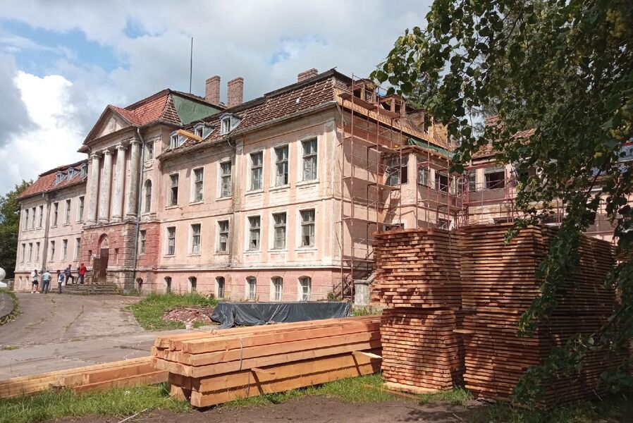 В поселке Железнодорожном начались ремонтные работы в историческом здании крайсхауса. Сейчас идет замена кровли и уже перебрали дымоход. Об этом сообщается в группе «Башни Востока» «ВКонтакте».