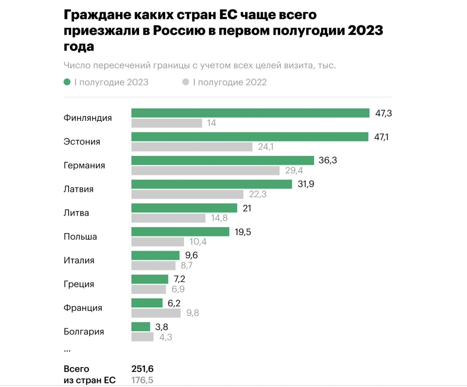 В РБК отмечают, что если брать только одну цель визита — туризм, то в лидерах окажется Германия. Оттуда в первом полугодии 2023 года въехали с туристическими целями в Россию 17,5 тыс. раз (8,5 тыс. в первом полугодии прошлого года). Далее следуют Польша и Латвия.