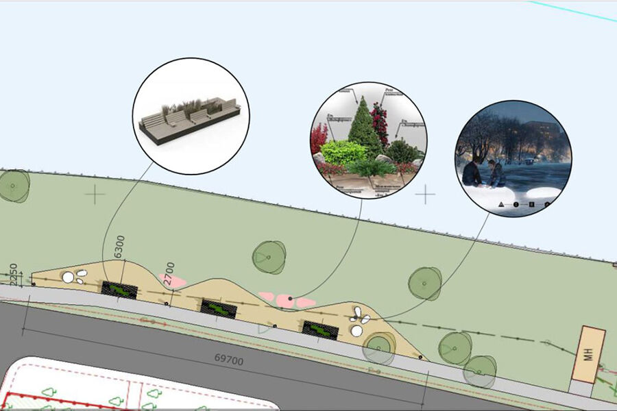 Планируется, что зелёную фотозону украсят горные сосны, западные туи «Смарагд», лежачий и казацкий можжевельник, барбарис тунберга и снежноягодник. Всего подрядчику предстоит высадить 17 саженцев кустарников и деревьев высотой до 2 метров. Также в планах монтаж деревянной террасы и посев газона.