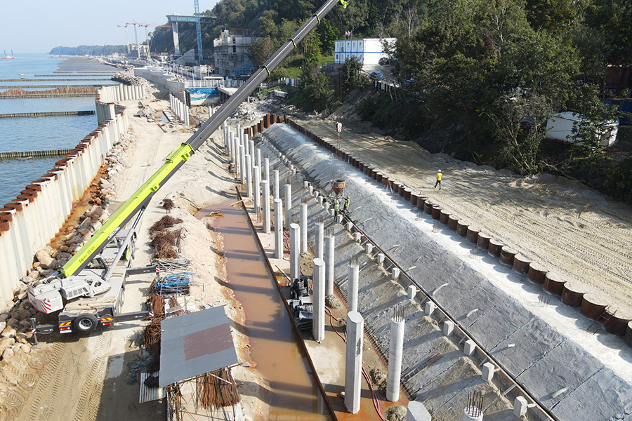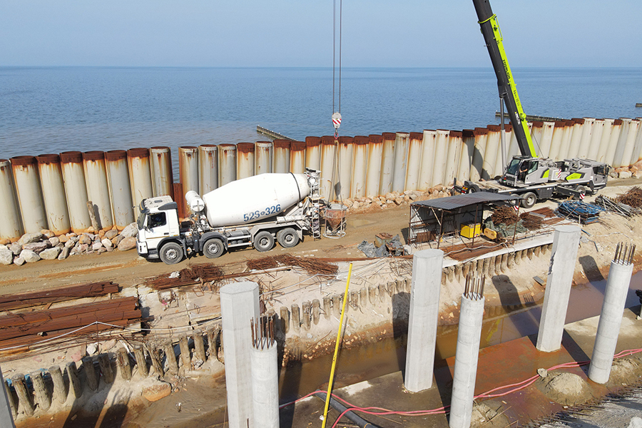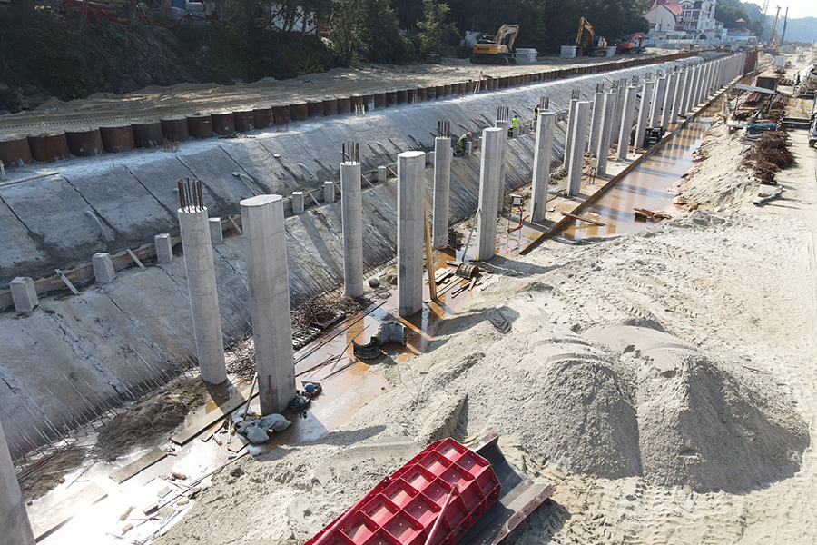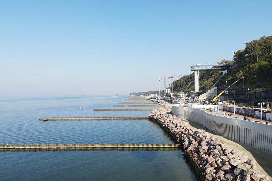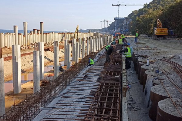 «Идёт строительство волногасящей части набережной протяженностью 660 метров. Рабочие забили более 1000 свай, смонтировали ростверки, разделяющие стены, положили плиты перекрытия. А также подготовили к заливке конструкции стен для монтажа лестничного спуска. Производится отсыпка песком части променада, устраиваемой по грунтовому основанию. Продолжаются работы по устройству свайного основания из буронабивных свай. Подготавливается участок для монтажа локальных очистных сооружений», сообщают в минстрое.