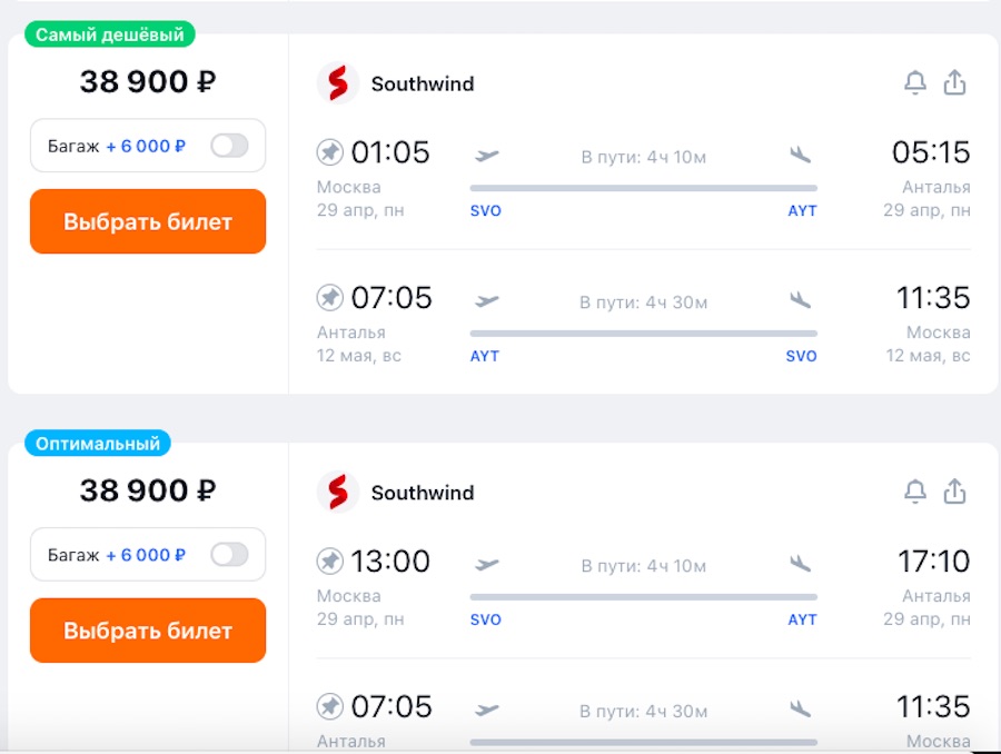 Также авиакомпания Southwind Airlines в понедельник выставила на продажу билеты на рейсы из Москвы в Анталью, которые начинаются от 38900 рублей в оба конца — в полтора раза дешевле, чем предлагают другие авиакомпании.