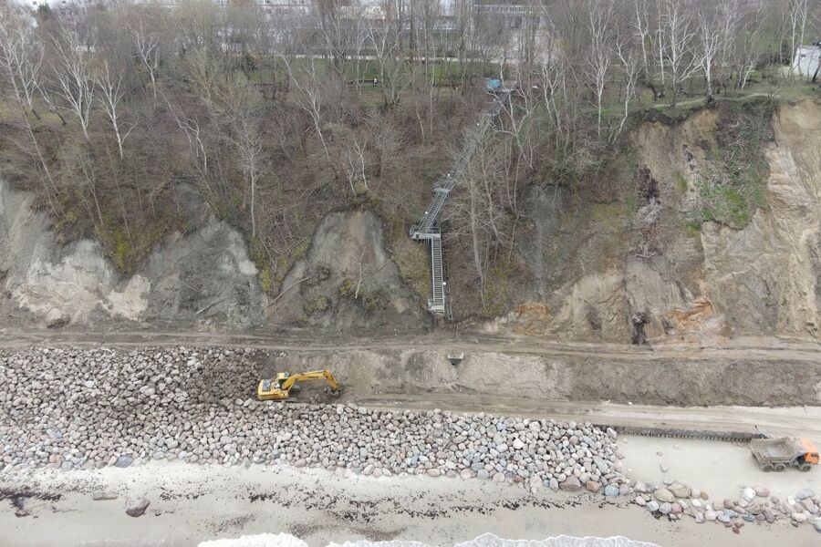 «Объект протяженностью 475 метров представляет собой волногасящую берму из крупногабаритного камня, который укладывается в основании абразионно-оползневого склона, — говорится в публикации. — Сейчас реконструкция выполнена уже на 63%: защищены каменной бермой объемом более 17 тысяч кубических метров наиболее опасные участки — 350 метров берегового склона с восточной и западной сторон».
