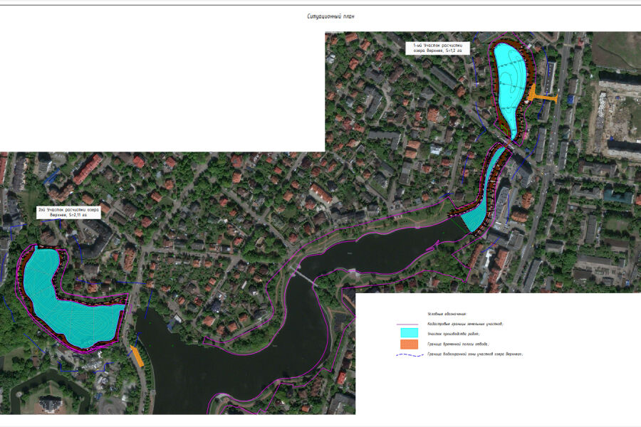 Общая протяжённость участков составляет 800 метров. Первый расположен между домами № 16В по улице Льва Толстого и № 29 по улице Верхнеозёрной. Второй тянется от впадения Ботанического ручья в озеро до Паркового моста. Исполнителя работ в срок до 28 ноября 2025 года обяжут ликвидировать последствия загрязнений водоёмов и улучшить их экологическое состояние, а также предотвратить истощение озера. Подрядчика определят 7 июня. Заказчиком работ выступает ГАУ КО «Экологический центр «ЕКАТ—Калининград», подведомственное региональному минприроды. Начальная (максимальная) цена контракта составляет 21,7 млн рублей.