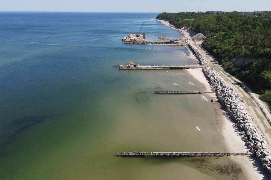 В акватории Балтийского моря в районе Светлогорска продолжается строительство волнолома, входящего в 1-й подэтап пляжеудерживающих сооружений. О процессе его возведения в своем официальном паблике «ВКонтакте» отчиталась «Балтберегозащита».
