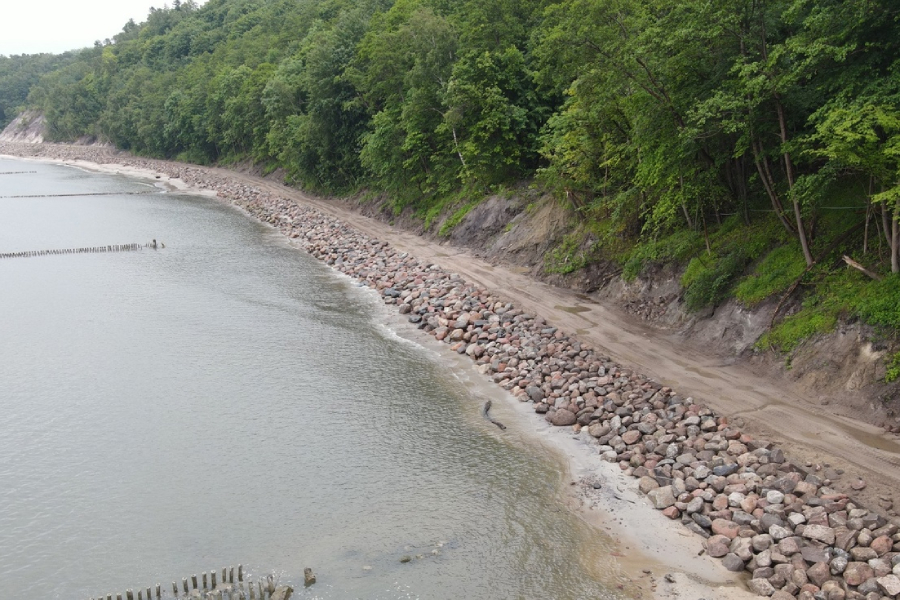 «Балтберегозащита» отметила, что протяжённость навала из крупногабаритных камней, которые укладываются в основании абразионно-оползневого склона, составляет почти 900 метров.