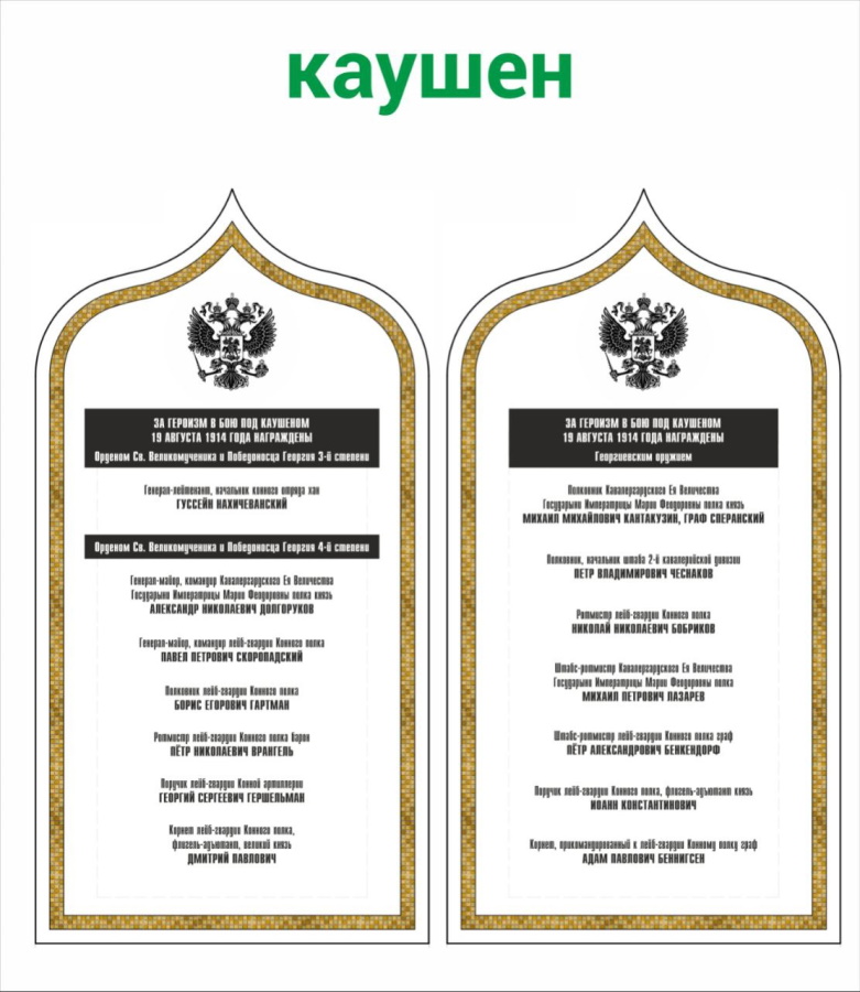 В Гусеве к 110-летию начала Первой Мировой войны планируют увековечить память барона Петра Врангеля (после 1917 года один из главных руководителей Белого движения) и генерал-майора Павла Скоропадского, ставшего после революции 1917 года украинским гетманом. Фамилии военачальников, как сообщил «Новому Калининграду» исполняющий обязанности директора калининградского Историко-художественного музея Сергей Якимов, собираются поместить на мемориальных табличках, посвященных офицерам, ставшим георгиевскими кавалерами по результатам Каушенского сражения.