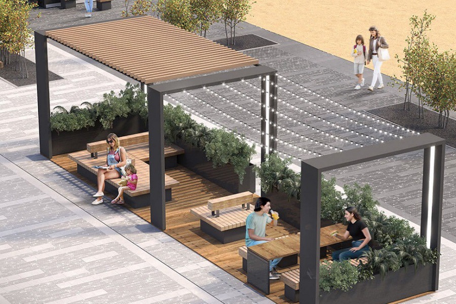 Уточняется, что для освещения территории предусмотрены парковые светильники и гирлянды. Замощение пешеходной зоны оформят мультиформатной плиткой белого и графитового цвета. Также предусмотрено озеленение территории, высадка новых кустарников, устройство газона.