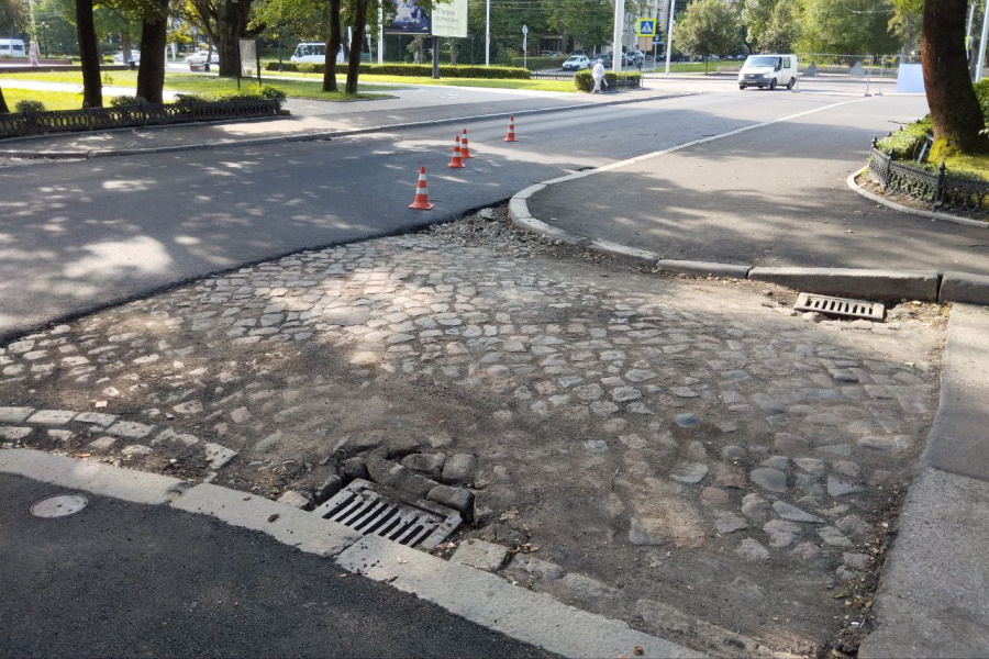 Глава администрации Калининграда Елена Дятлова рассказала, можно ли оставлять брусчатку, которую подрядчики время от времени обнаруживают под асфальтом при ремонте улиц. В качестве примера был приведен ремонт улицы Брамса, где подрядчик снял с брусчатки старый асфальт, а сверху положил новый, не убирая булыжник.